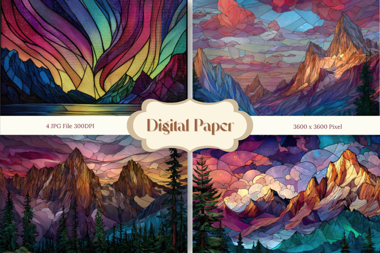 Digital Paper Pack Craft Supplies Background Paper Mountain View Stained Glass Background Stained Glass Texture Window Stained Glass Mountain View Background Mountain Stained Glass Background Mountain View Stained Glass