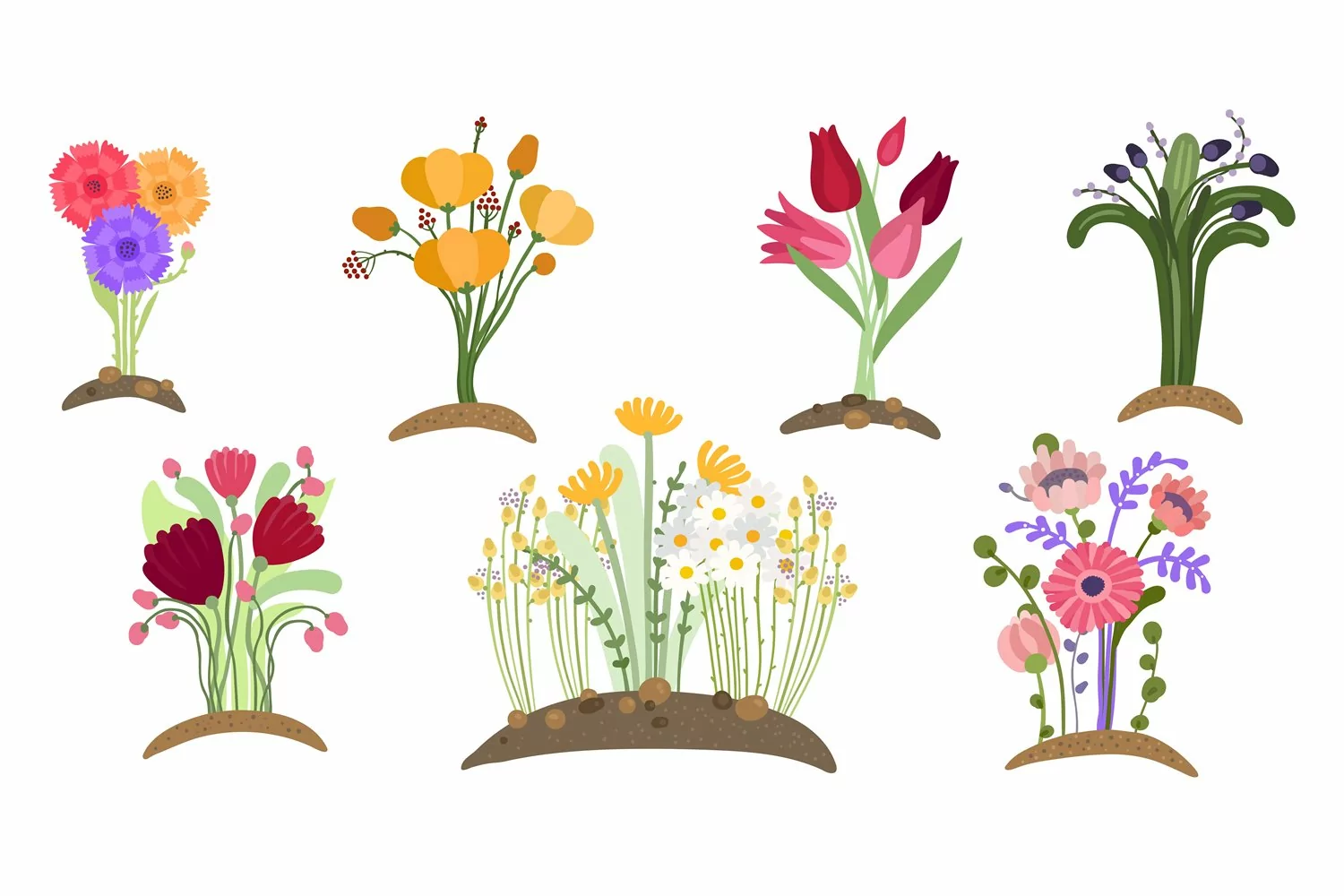 Forest flowers garden. Spring floral planting, simple gardening. Blossom fields, isolated bouquets growing. Springtime plants vector set. Illustration early blossom flower, foliage decoration botany