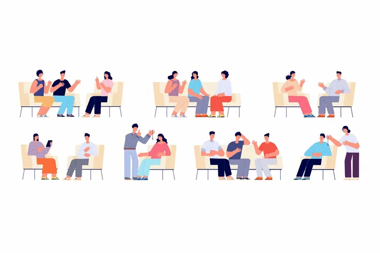 Psychotherapy. Professional therapy, cartoon woman on psychology training. Isolated support group, people with coach and family help vector set. Illustration couch psychotherapy, psychology support