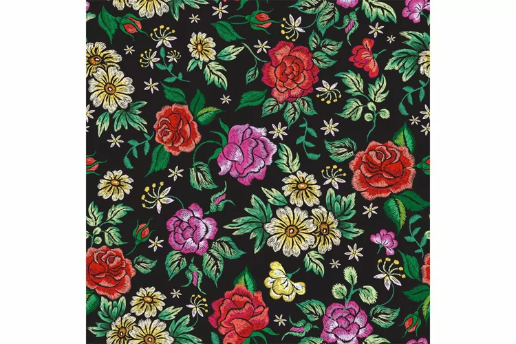 Floral embroidery pattern. Embroidered background, flower garden vintage print. Silk stitch imitation, roses, peony and daisy nowaday vector seamless texture. Illustration of pattern floral embroidery