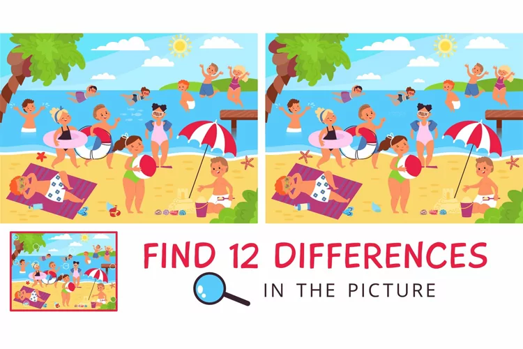 Find difference. 12 differences in picture with happy kids on beach. Paper game location for attention training, summer children puzzle, vector scene. Illustration of education puzzle riddle game