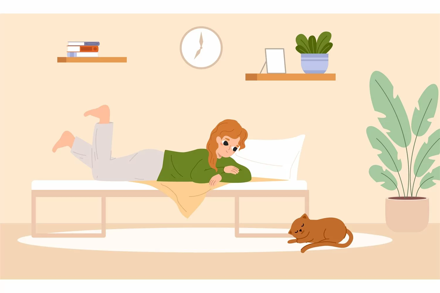 Girl resting on bed and looking at cat. Cute kitten sleep, teens relax in bedroom. Home lazy time, cartoon student tired, vector cozy scene. Illustration of girl and cat relax