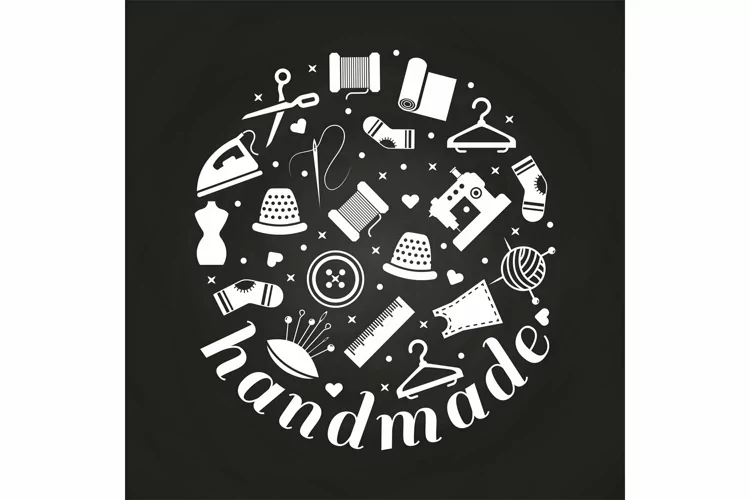 Handmade or handwork round concept on chalkboard with sewing, knitting, taylor icons. Vector illustration