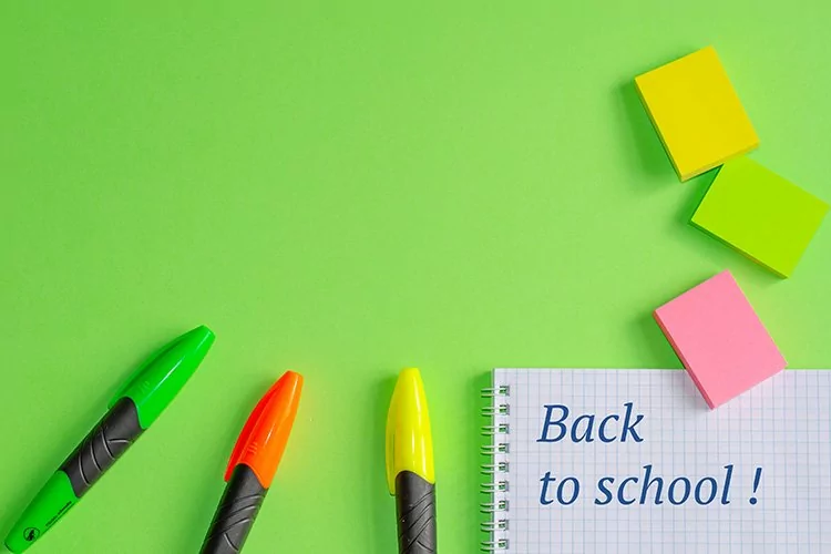 Text "Back to school" on notebook. Horizontal banner for web design. Collection of school supplies in a bright flat style. Educational concept. Copy space, mockup, overhead, template.