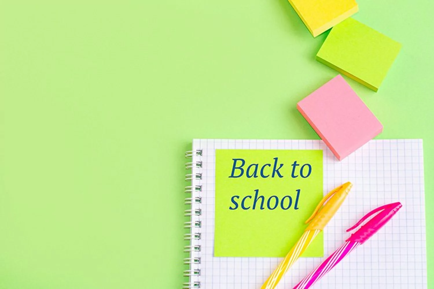 Text "Back to school" on notebook. Horizontal banner for web design. Collection of school supplies in a bright flat style. Educational concept. Copy space, mockup, overhead, template.
