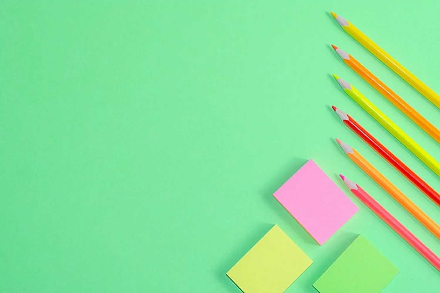 Text "Back to school" on notebook. Horizontal banner for web design. Collection of school supplies in a bright flat style. Educational concept. Copy space, mockup, overhead, template.