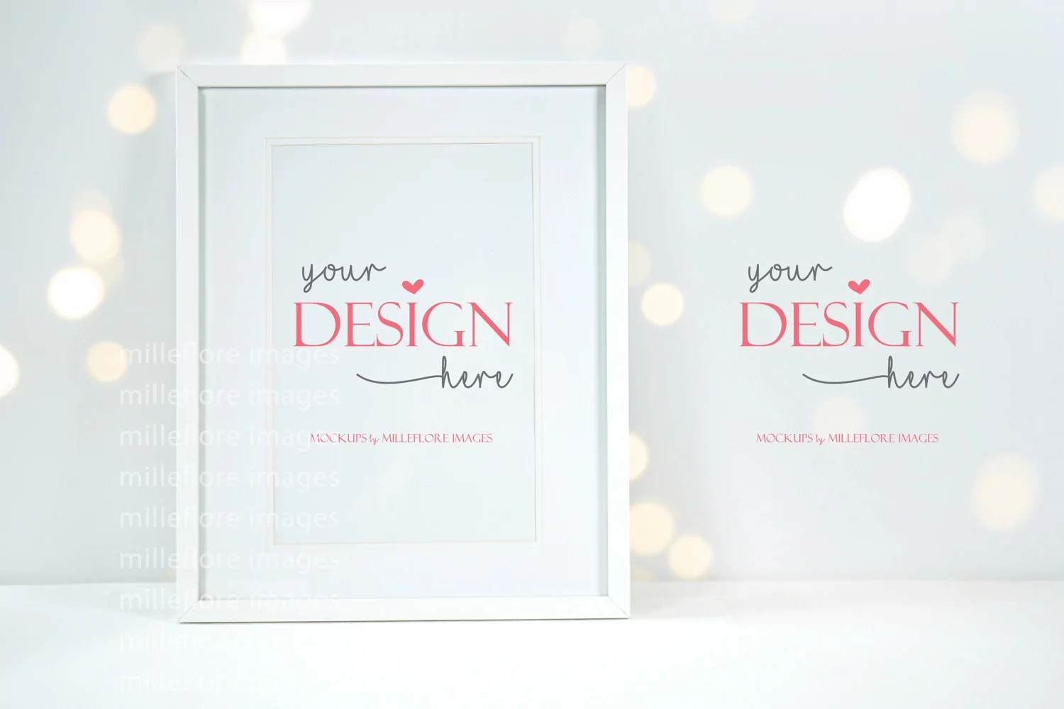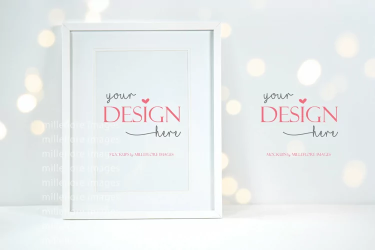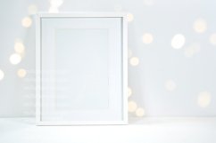Bokeh Party Fairy Lights Theme. Artwork, Poster, Wall Art, Print, Art, Picture Frame Styled Stock Mockup Photo. Vertical Wooden Frame with Additional Copy Space. Instant digital download product mockup photo.