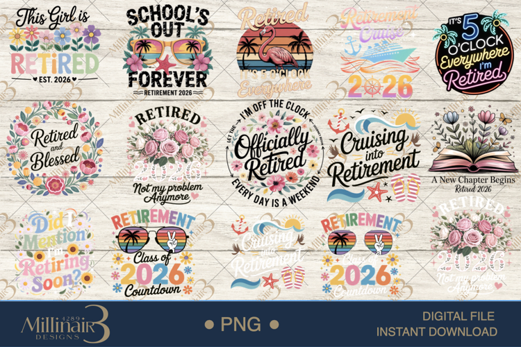 Celebrate retirement with humor and style using this Officially Retired 2026 PNG set! Featuring 14 designs in both black and white versions, this bundle is perfect for creating shirts, mugs, tote bags, invitations, party signs, scrapbooks, and wall art. With multiple styles to choose from, you’ll have everything needed for a memorable retirement celebration.