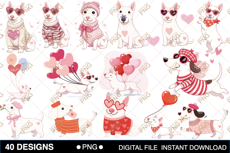 🐾 Funny Bull Terrier Valentine Clipart – 40 PNGs 💌