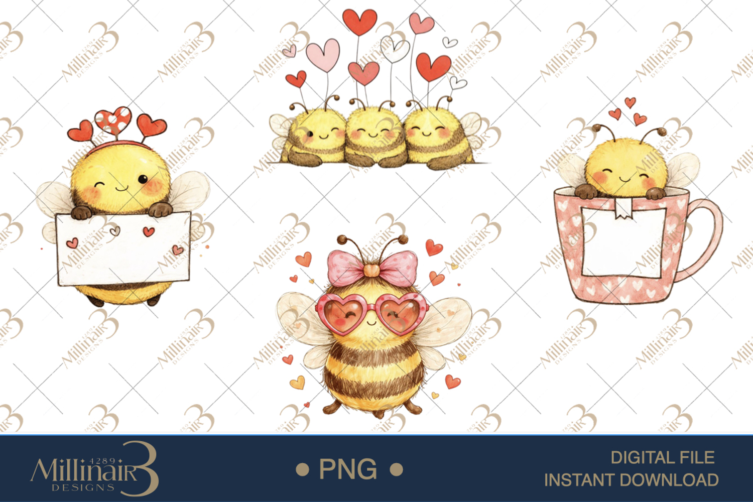 🐝 Cute Valentine Bee Clipart – 4 PNG Files ❤️ High-Res Digital Download