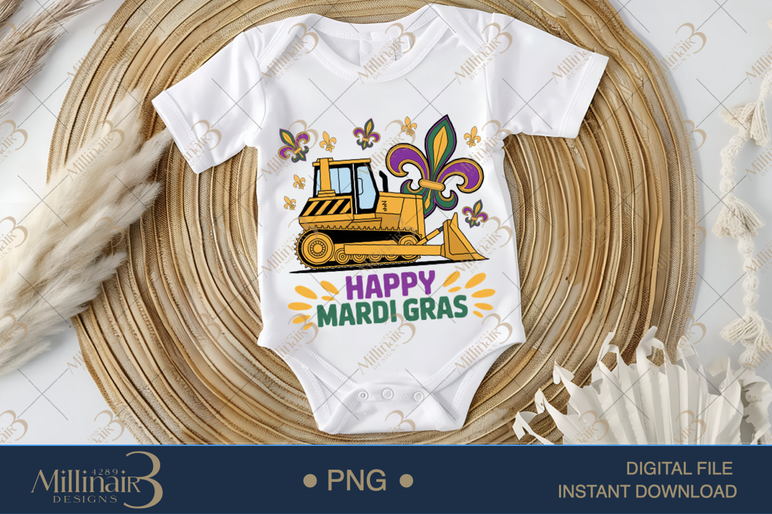 Featuring a bold yellow bulldozer decorated with classic purple, green, and gold fleur de lis accents — this fun graphic is perfect for parade season, parties, and festive apparel.