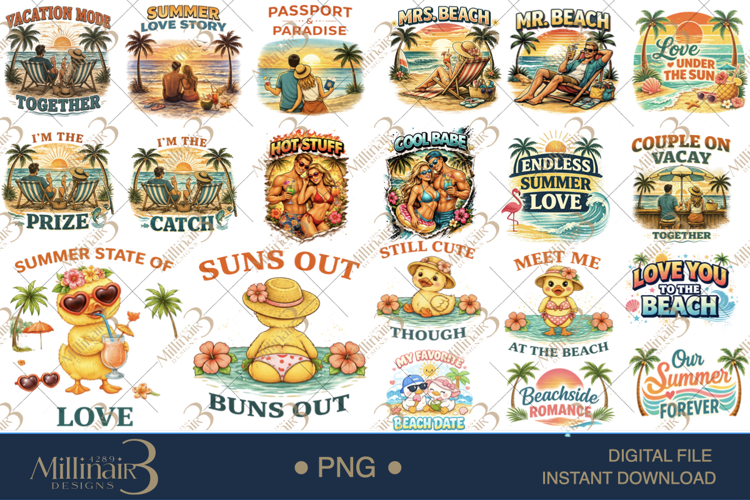 This **20-piece Summer Love Bundle** is packed with romantic beach scenes, funny couple quotes, and adorable duck designs — perfect for creating standout products all season long.