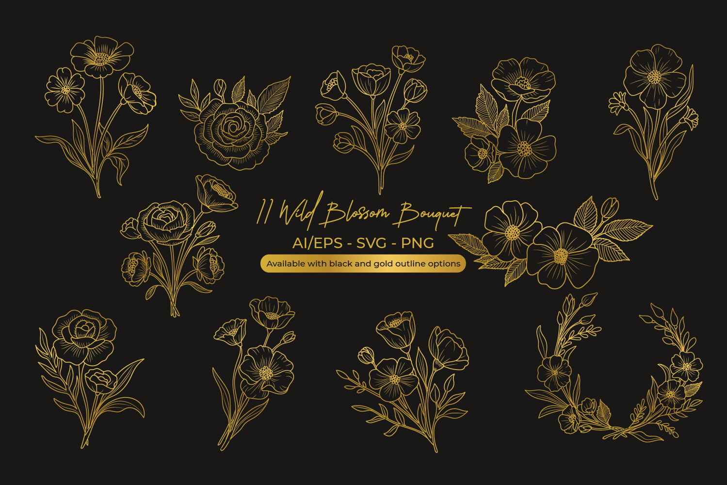 Add a touch of sophistication to your creative projects with this Vintage Wild Blossom Line Art vector set. Carefully crafted in Adobe Illustrator, this collection features 11 hand-drawn floral elements in classic black and gold line art outlines. The elegant line work and fine botanical details make it ideal for a variety of design purposes such as wedding invitations, greeting cards, packaging design, branding and logo design, social media graphics, wall art and posters.