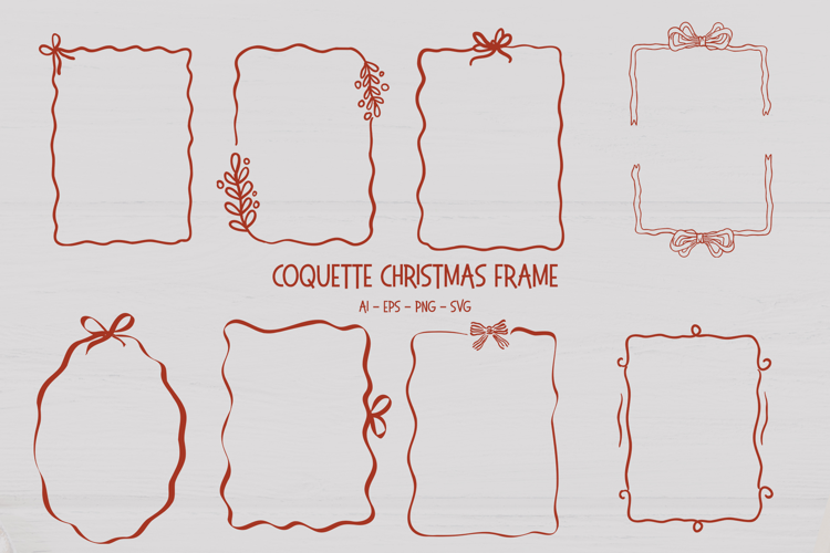 Add a sweet and festive touch to your holiday projects with this Coquette Christmas Frames Collection. This set features hand-drawn, whimsical frames inspired by coquette aesthetics, soft pastel tones, and classic Christmas elements like holly, berries, and decorative patterns.