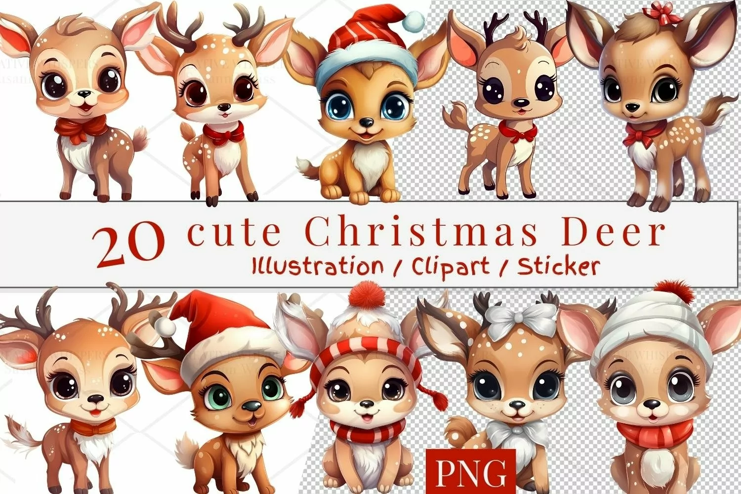 20 cute Christmas Deer, Sticker, Clipart Ornaments, PNG