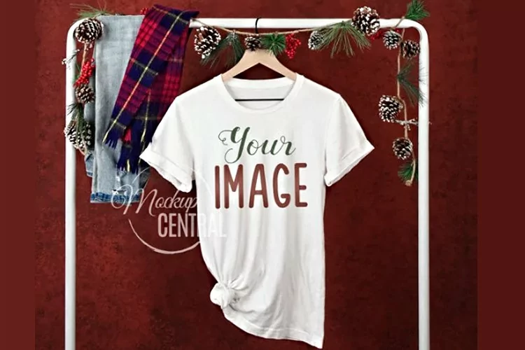 Enjoy this blank white woman's t-shirt Mockup Styled Stock Photography to insert your image or text into for a fashion design product. This is a bella canvas clothing shirt hanging on a red wall with a Christmas prop. Makes a perfect layout for a Cozy Winter graphic design theme.