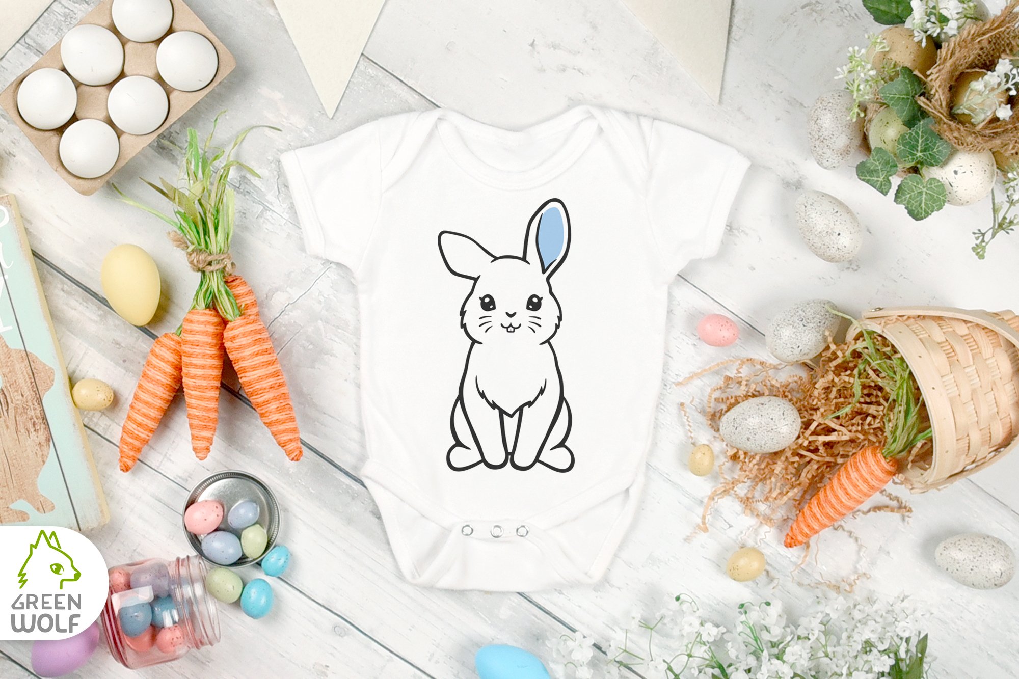 Enjoy this Blank Baby Infant Newborn White Bodysuit, Babygrow, One Piece, Mockup Styled Stock Photography to insert your image or text into for a fashion design product. Makes the perfect apparel layout for a baby fashion concept for a Easter graphic. There is a eggs and Easter props props on a wood background.