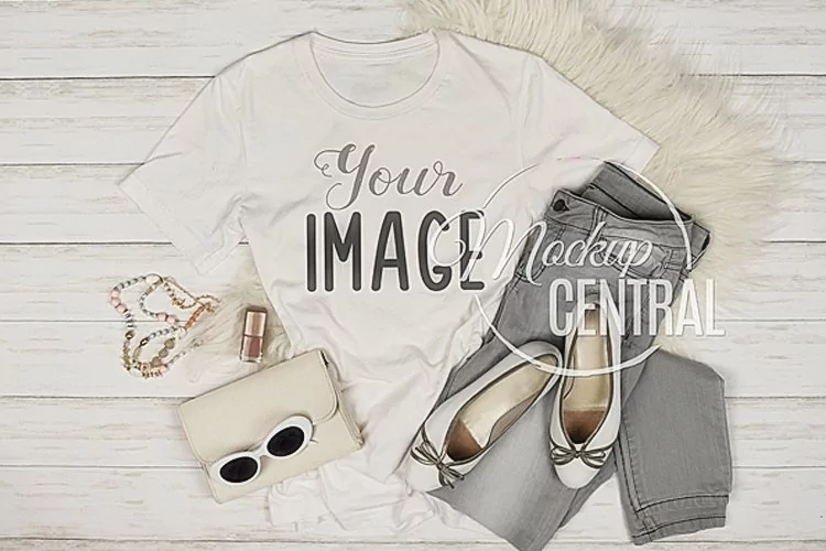 Enjoy this Woman's Chic Blank white t-shirt Mockup Styled Stock Photography to insert your image or text into for a fashion design product. This is a photo for a ladies clothing graphic design to add your graphic design to. There is are jeans and white shoes on a wood wall background.