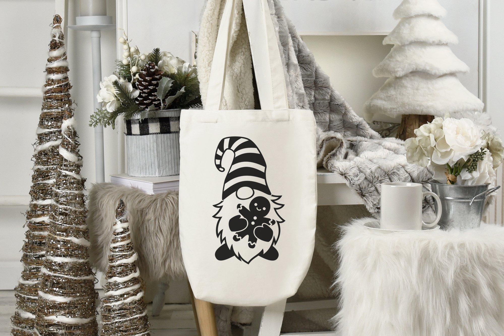 White Winter Christmas Tote Bag Mockup JPG on Chair example image 1