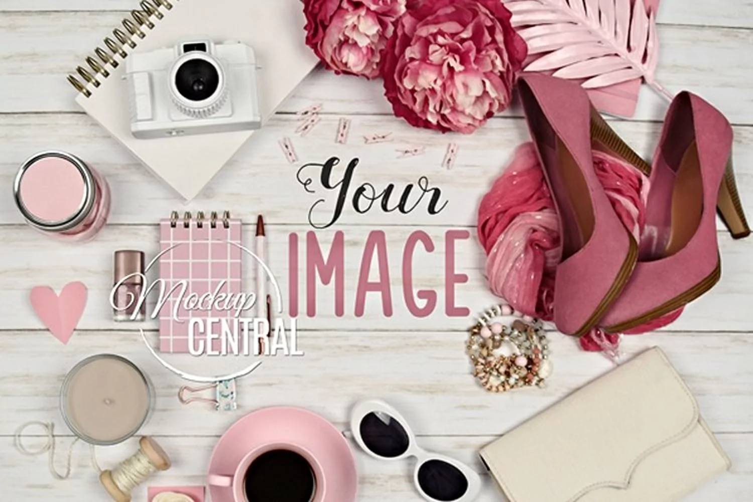 Enjoy this pretty pink fashion styled stock styled mockup on a wood background to insert your image or text message into. There is a blank area in the middle to add your image, product or graphic text. Makes the perfect blog image.
