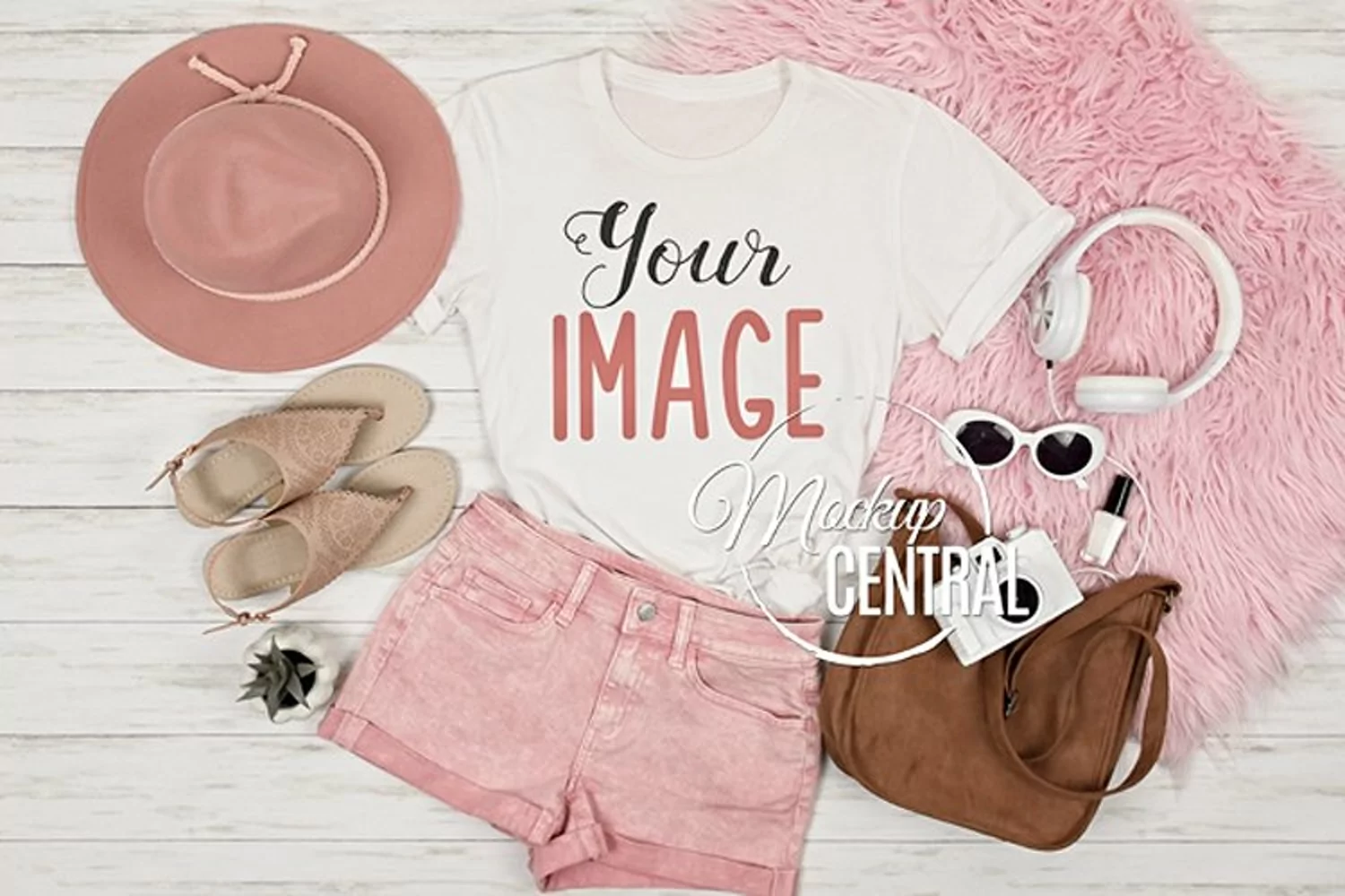 Enjoy this woman's bella canvas blank white crew neck t-shirt pretty pink spring mockup to insert your image or text into for a fashion design product. There are jeans shorts, sandals and a hat on a wood background. Makes the perfect mock up shirt template for a Easter, Spring or Summer theme. This is a digital styled stock photo JPG file. There are NO Layers.