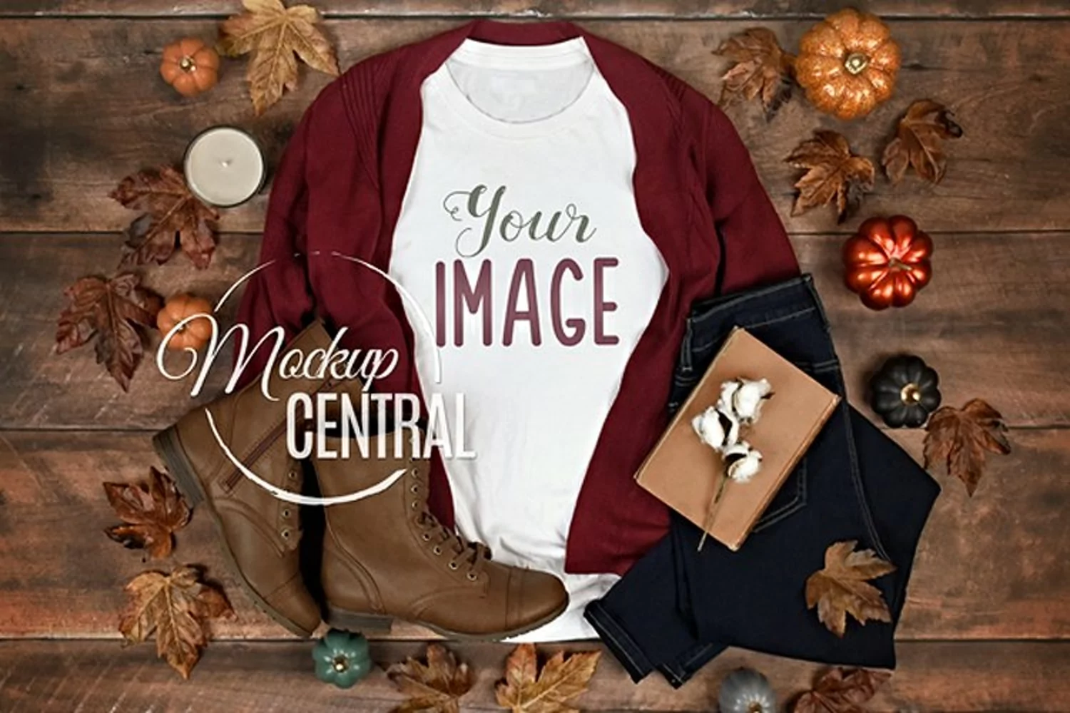 Enjoy this women's bella canvas blank white crew neck t-shirt Fall Halloween Mockup Styled Stock Photography to insert your image or text into for a fashion design product. There are boots and leaves on a rustic wood background.