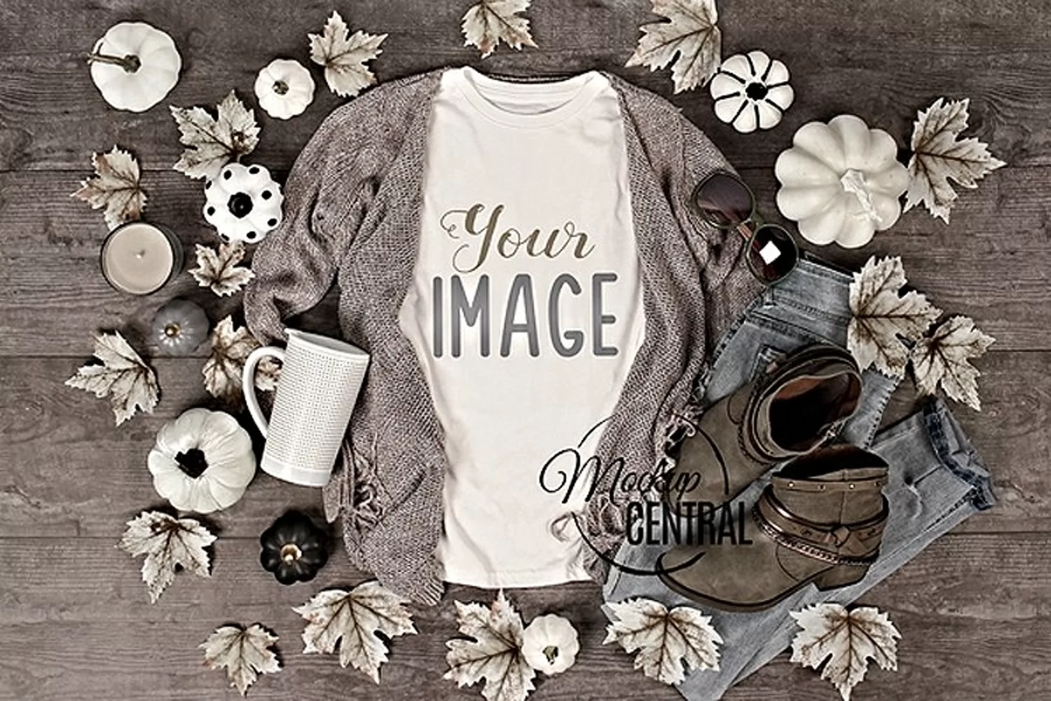 Enjoy this women's bella canvas blank white crew neck t-shirt Fall Mockup Styled Stock Photography to insert your image or text into for a fashion design product. There are pumpkins and leaves on a rustic wood background. This is a digital product. The shirt is for designers to add their graphic or photo to. Makes the perfect photo flat lay for an autumn, Halloween or thanksgiving concept.