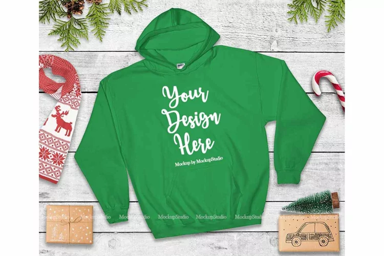 Christmas Irish Green Hoodie Mock Up, Winter Holiday Gildan 18500 Heavy Blend Blank Hooded Sweatshirt Mockup, Unisex Women Men Flat Lay Display