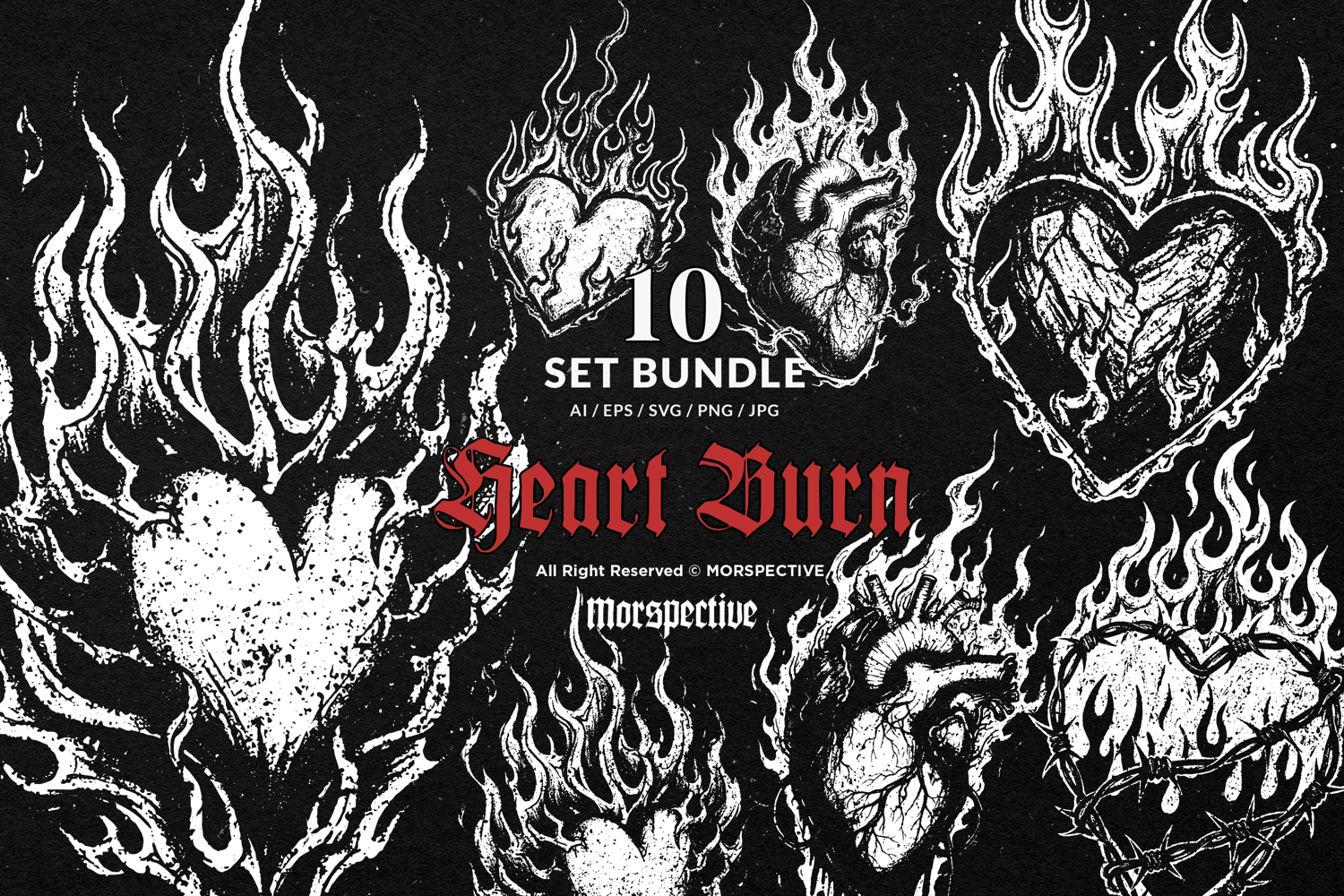 10 Bundle Dark Art Heart Burn Fire Flame Burning Skull