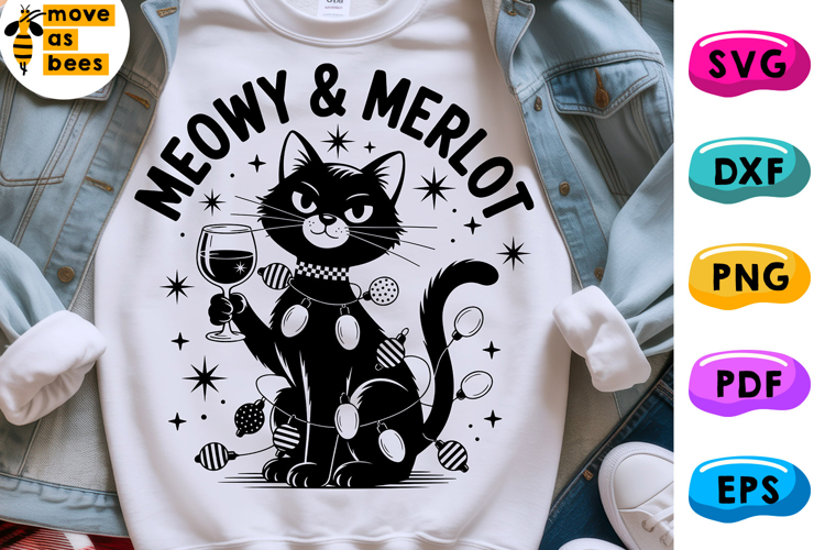 Meowy & Merlot Svg, Png, Christmas Black Cat with Garland, Template for Sublimation, Cricut, Silhouette, Iron on, Heat Press Transfer