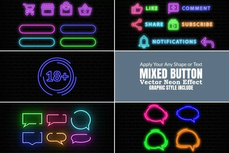 Unleash the vibrant glow of our Illustrator Neon Effect Collation! Designed for ease of use, this collection boasts a variety of graphic styles for instant application on any text or shape. Elevate your designs effortlessly by changing colors, shapes, and backgrounds with a simple click. Whether you're a seasoned designer or just starting, our neon effects offer versatility and simplicity. We've curated a selection of pre-designed shapes and text, but the real magic lies in your ability to apply this electrifying effect to your own creations. Transform your artwork instantly – try our Illustrator Neon Effect Collation now!