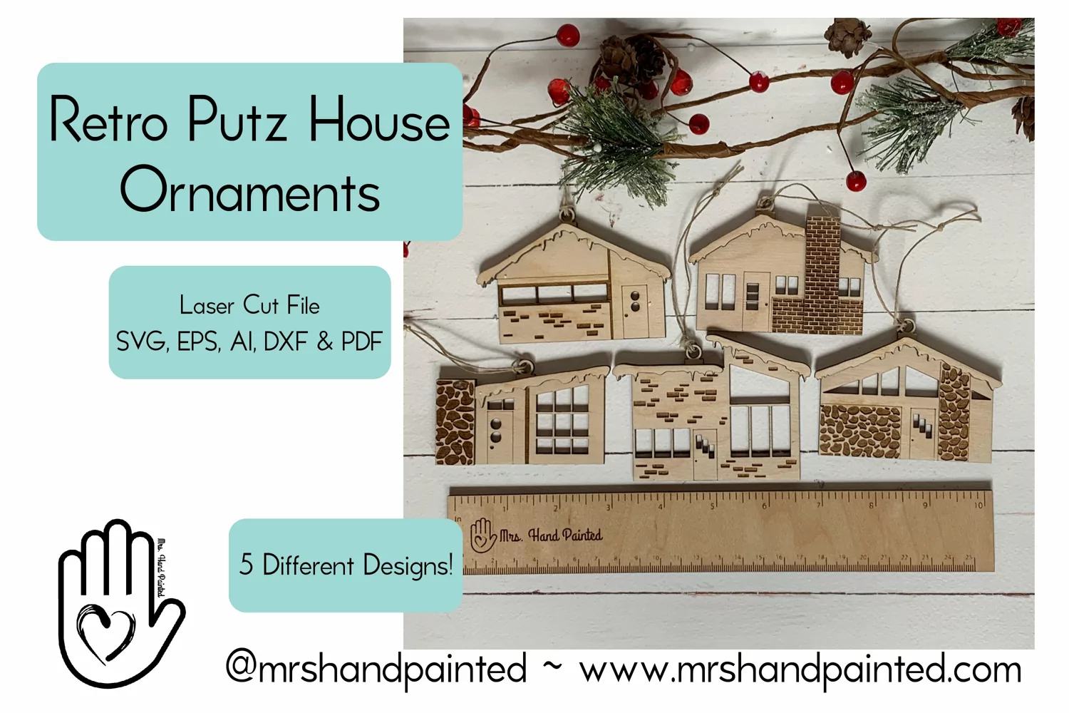 5 different retro putz house designs turned into Christmas ornaments! All ornaments have two layers, the snow layer and the chimney pieces on two of the houses are glued on the bottom layer. There are multiple score and engrave lines on each house design. I also have listed a standing house design with bases and trees to set the houses in at a larger scale.