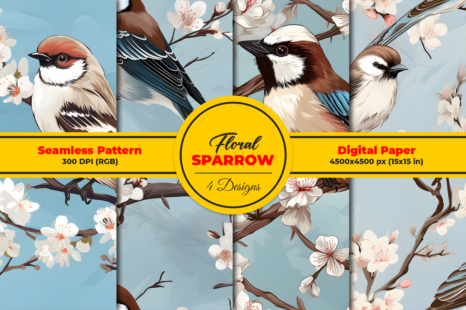 Floral Sparrow Seamless Pattern and Digital Paper Background