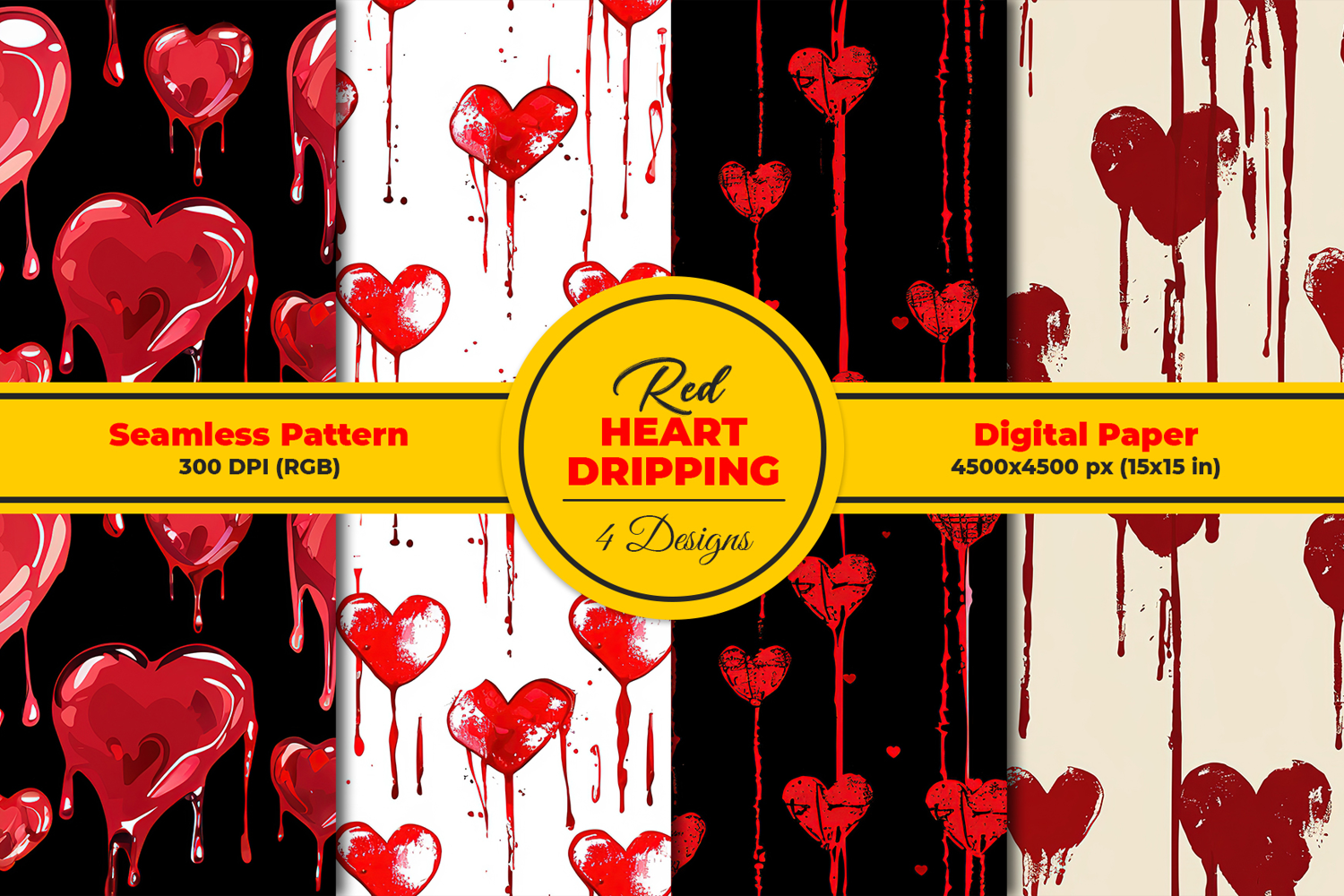 Red Dripping Hearts Seamless Pattern and Digital Paper