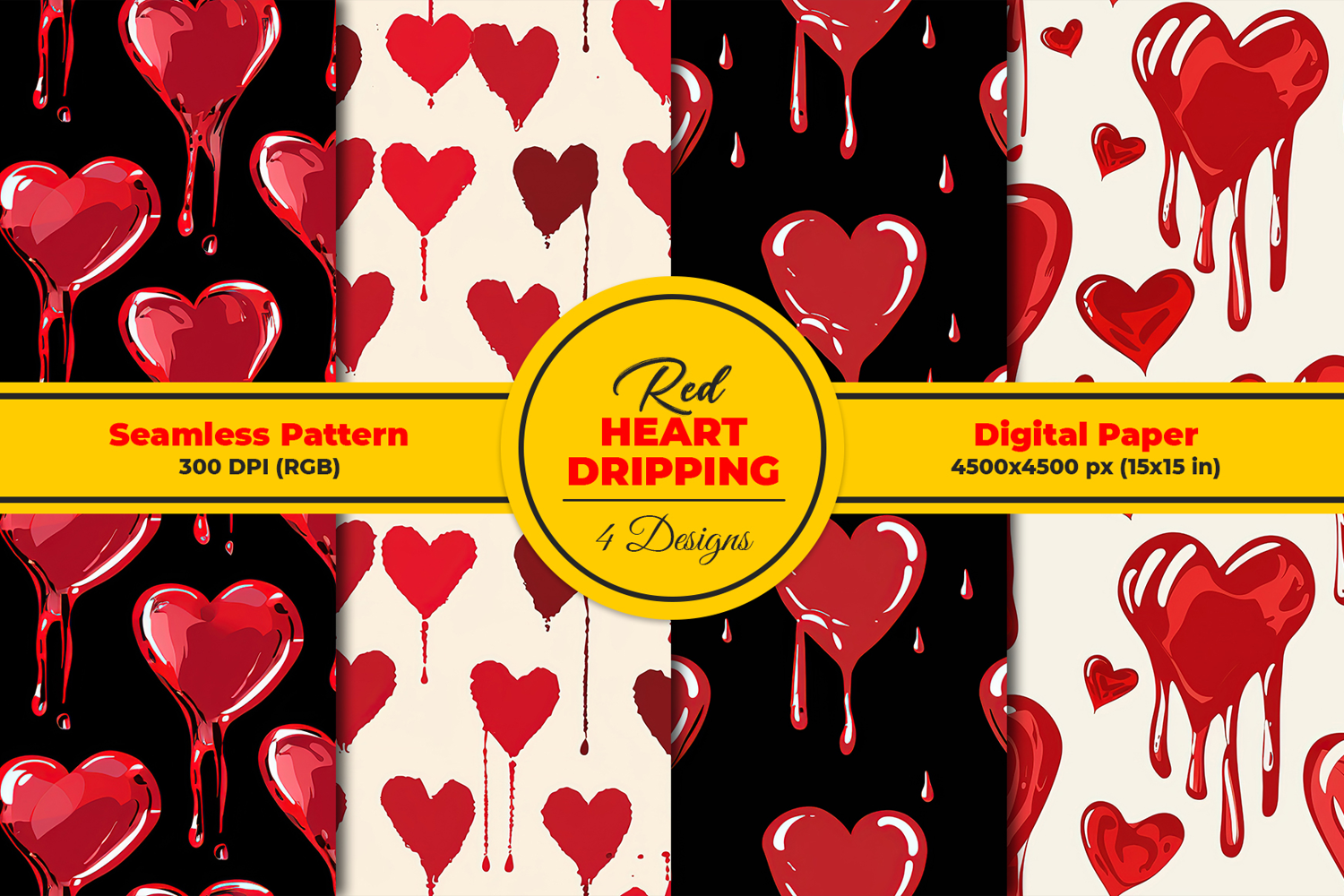 Red Dripping Hearts Seamless Pattern and Digital Paper