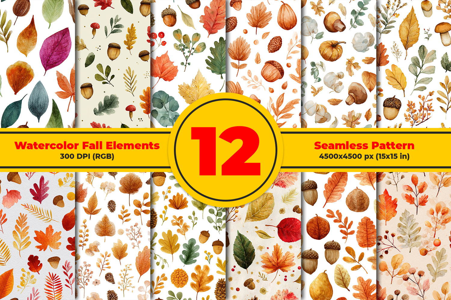 Watercolor Fall Elements Seamless Pattern and Digital Paper
