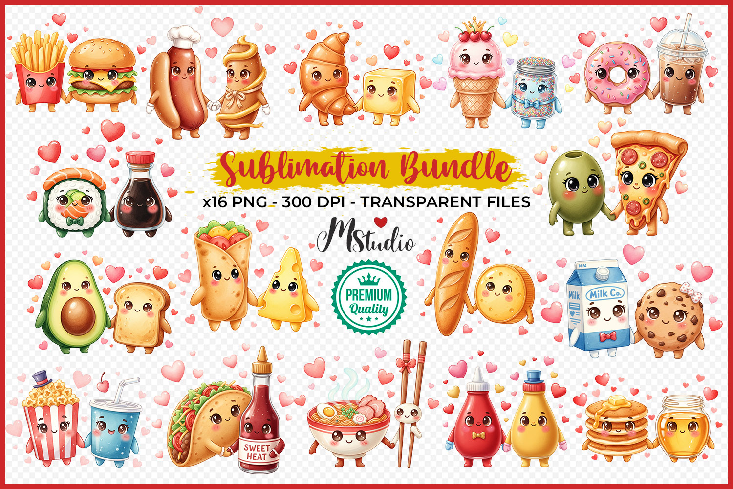 A cute 16-PNG sublimation bundle featuring kawaii food characters in 300 DPI with transparent backgrounds.