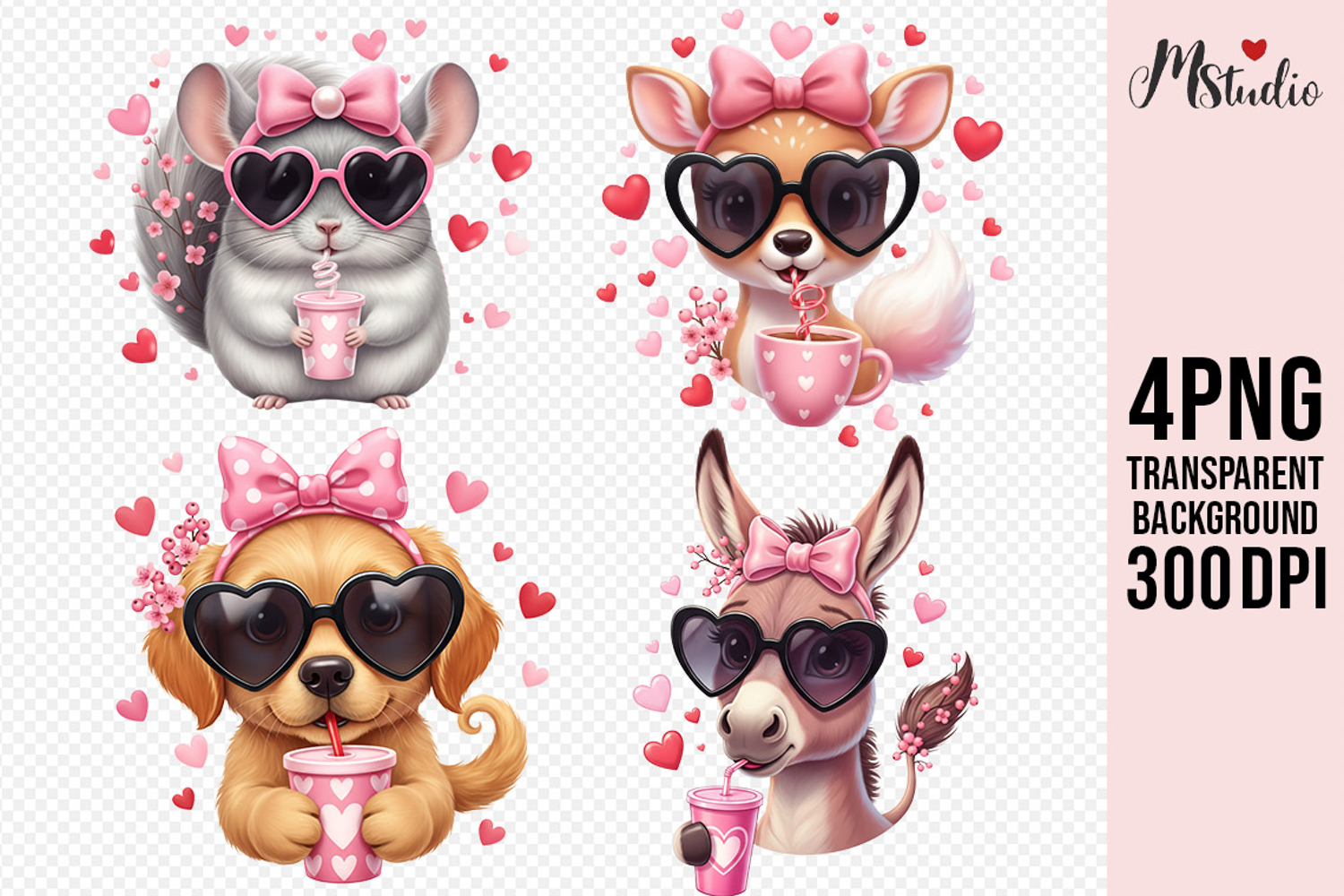A cute collection of four Valentine-style animal PNGs featuring a chinchilla, deer, dog, and donkey wearing heart-shaped sunglasses and sipping pink drinks.