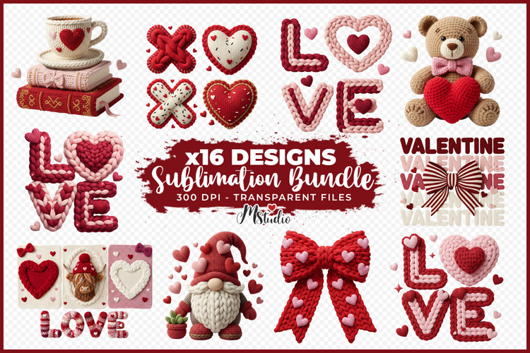A cozy Valentine clipart bundle featuring knitted love elements, hearts, bows, and romantic decorations. Ideal for sublimation, crafts, apparel, and print-on-demand projects.