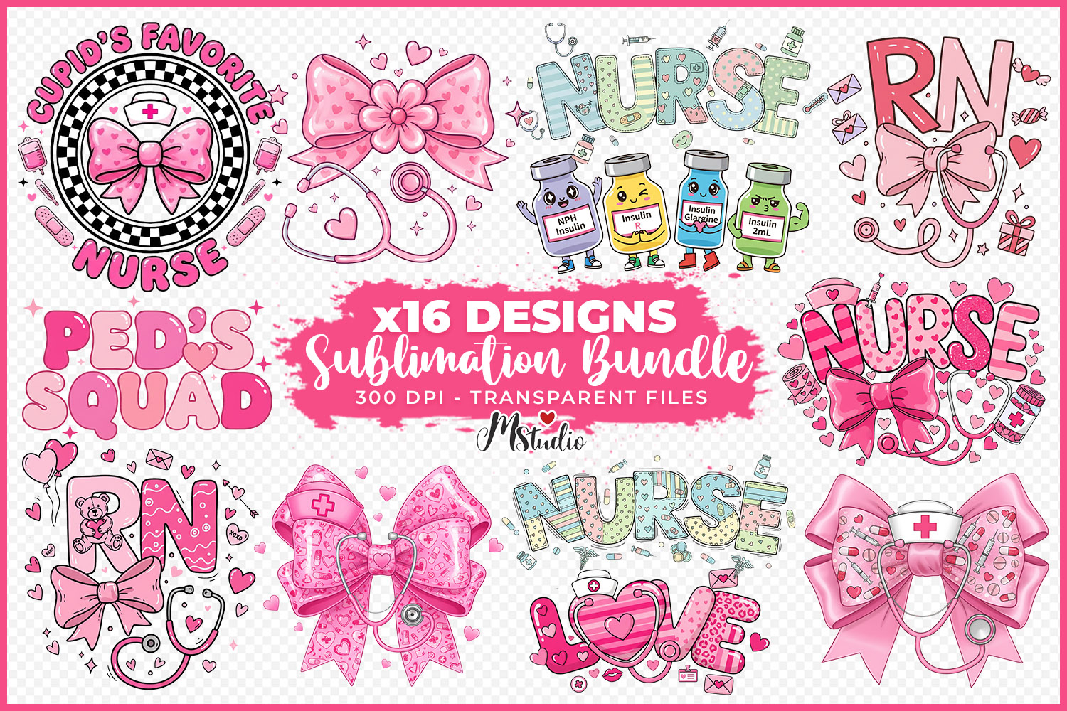 Cute nurse Valentine sublimation bundle featuring pink medical illustrations, bows, stethoscopes, insulin bottles, and nurse-themed lettering. Includes 16 high-quality PNG designs with transparent background at 300 DPI, perfect for sublimation printing, t-shirts, mugs, gifts, and nurse Valentine crafts.