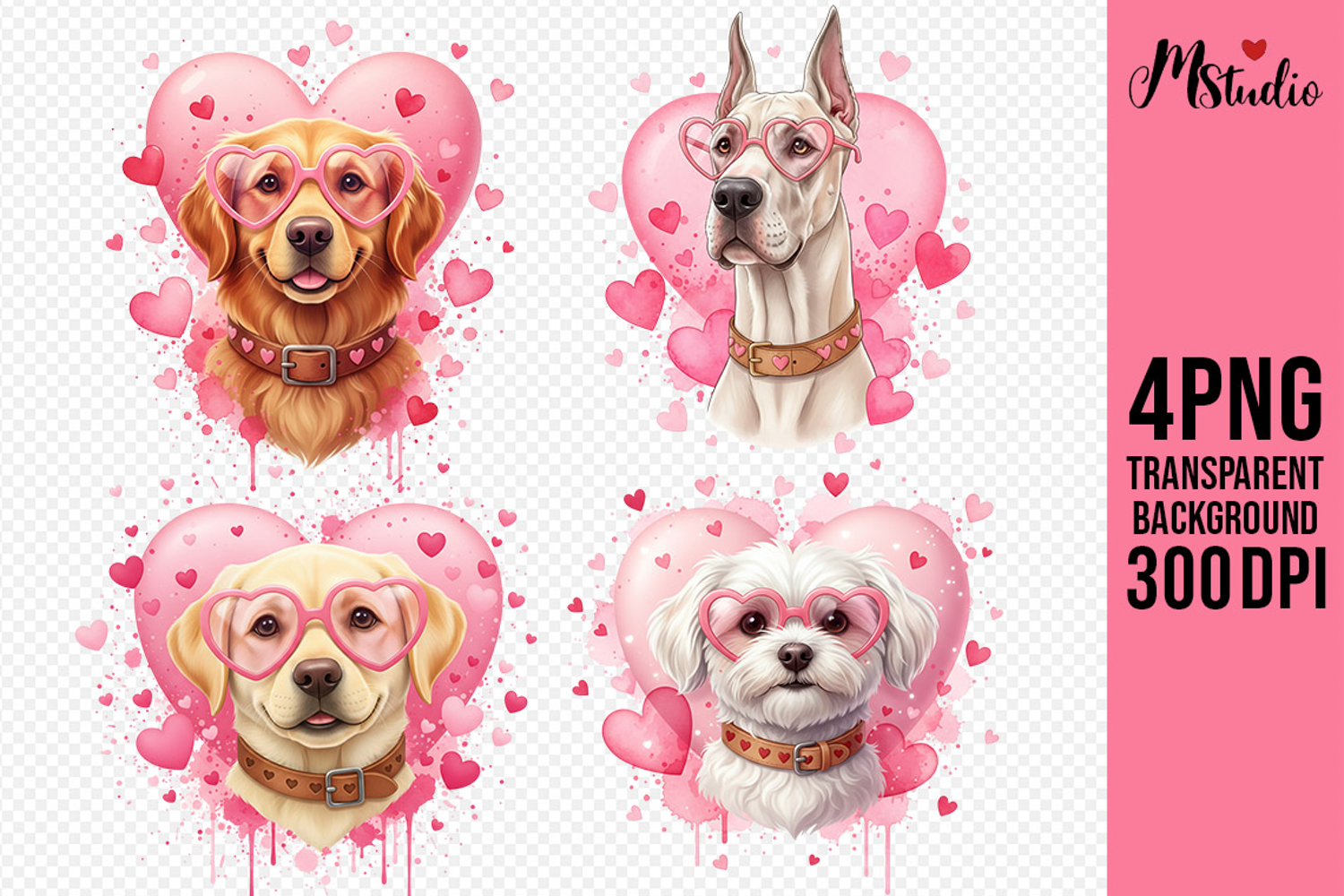 Adorable Valentine dog PNG bundle featuring sweet puppy portraits wearing heart-shaped glasses with pink heart backgrounds. Includes 4 high-resolution PNG files with transparent background at 300 DPI, ideal for sublimation, t-shirts, mugs, stickers, cards, and Valentine-themed pet designs.