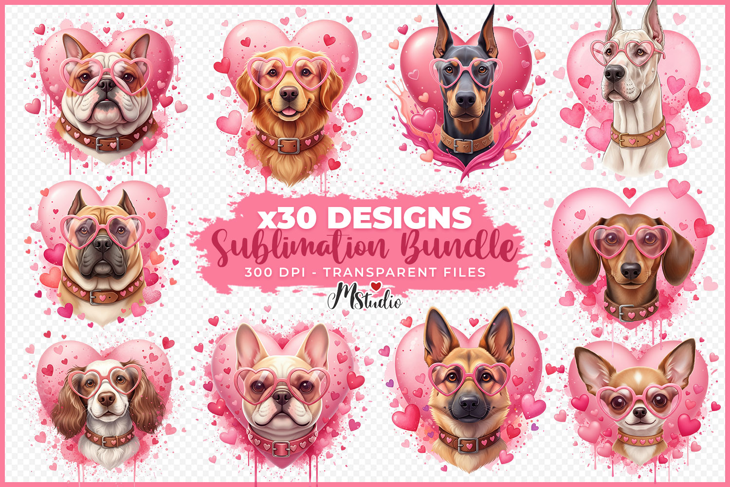 Large Valentine dogs sublimation bundle featuring cute puppies with heart-shaped glasses and pink heart backgrounds. Includes 30 high-quality PNG designs with transparent background at 300 DPI. Perfect for sublimation projects, t-shirts, mugs, stickers, gifts, cards, and Valentine pet-themed crafts.