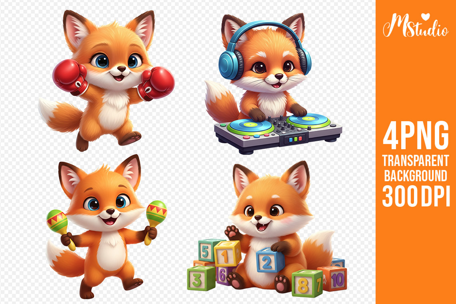 This Cute Fox Sublimation PNG Set includes 4 high-quality fox illustrations with transparent backgrounds at 300 DPI. Perfect for sublimation projects, kids designs, t-shirts, mugs, stickers, nursery decor, and educational prints. Each adorable fox features fun activities like music, boxing, counting, and play, making this bundle ideal for crafters, designers looking for premium, cute animal PNG graphics ready for print.