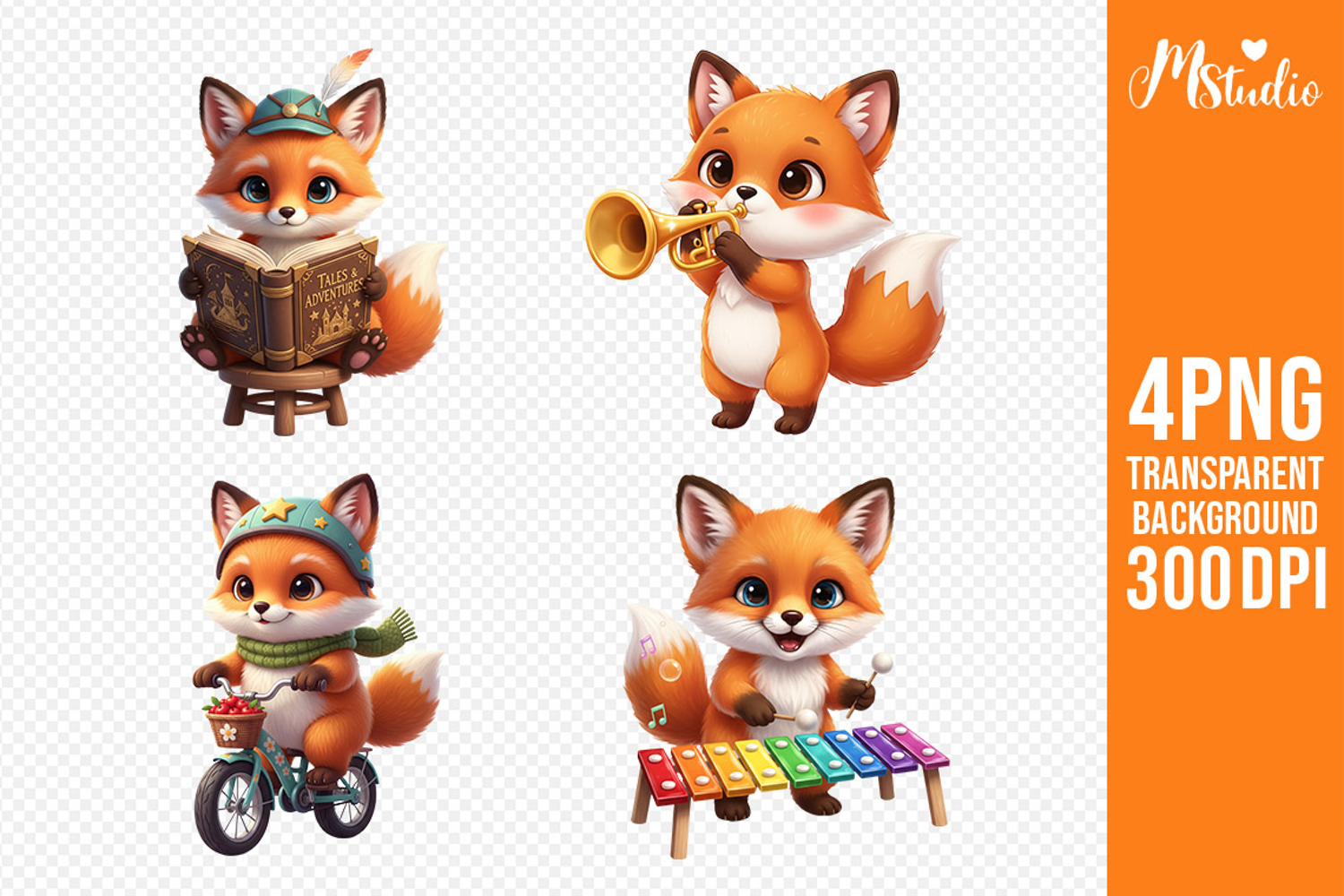 Cute Fox Activities PNG bundle with 4 adorable fox designs (300 DPI, transparent background). Includes fox reading a book, playing trumpet, riding a bicycle, and playing xylophone. Perfect for kids sublimation, t-shirts, mugs, nursery decor, educational projects, and printable crafts. Ideal for children’s themes.