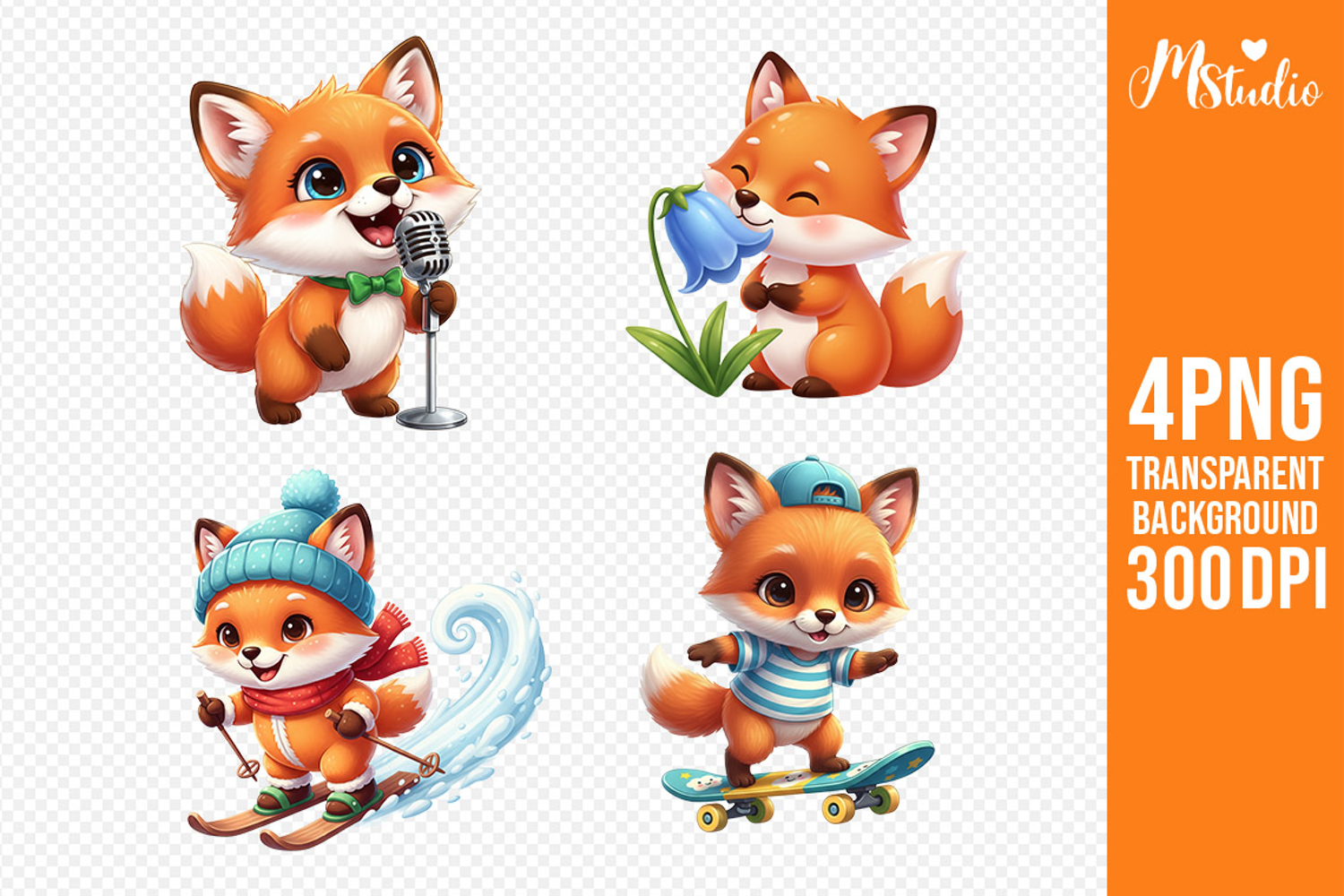 Cute Fox Moments PNG bundle featuring 4 adorable fox designs in different activities: singing with a microphone, smelling a flower, skiing in winter, and skateboarding. High-quality 300 DPI PNG files with transparent background. Perfect for kids sublimation, t-shirts, mugs, stickers, nursery decor, educational projects, and printable crafts. Ideal for children’s designs.