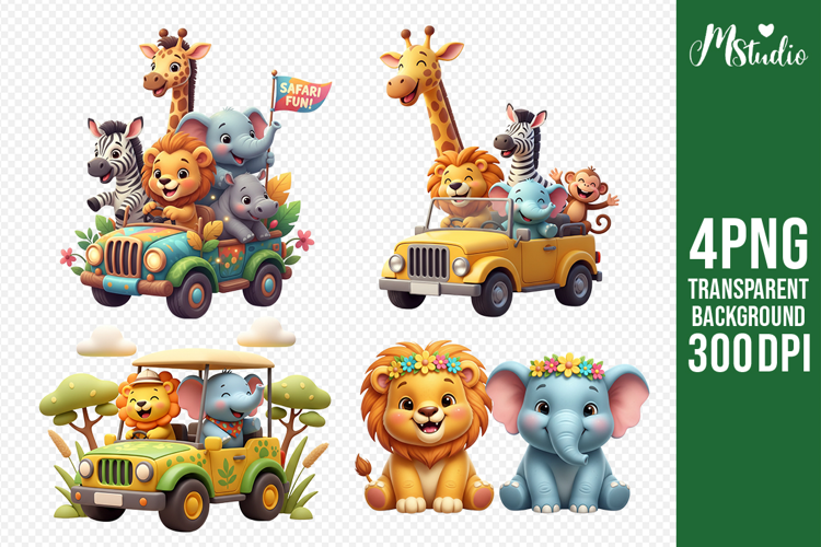 Cute Safari Animals PNG Bundle with 4 high-quality illustrations (300 DPI, transparent background). Features adorable safari animals including lion, elephant, giraffe, zebra, and monkey riding in colorful safari cars, plus cute sitting animals. Perfect for kids sublimation projects, t-shirts, mugs, stickers, nursery decor, classroom prints, and printable crafts.