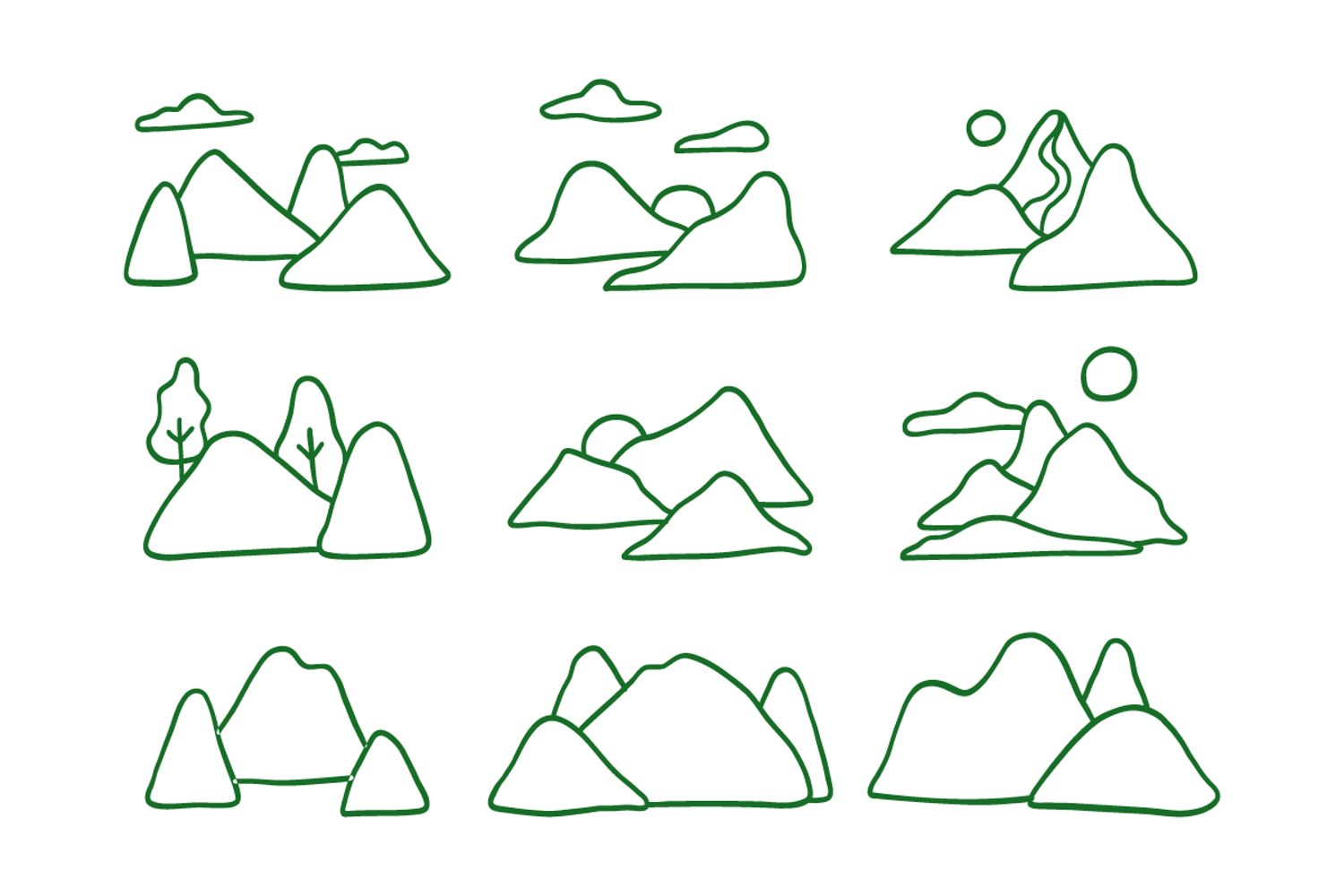 This hand drawn mountain landscape set features simple outline nature scenes perfect for travel design, outdoor themes, posters, branding, and creative projects.