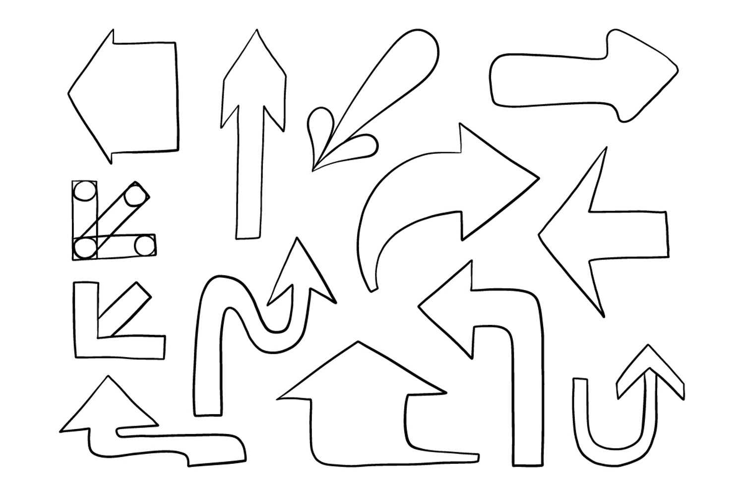 A collection of hand drawn arrow illustrations created in a clean doodle outline style. This set features a variety of arrow directions and shapes with expressive and dynamic lines.