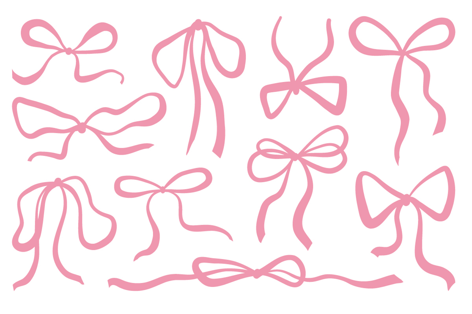 A collection of cute pink bow ribbon illustrations in a hand drawn doodle style. This set features various ribbon shapes with soft and feminine aesthetics, perfect for adding decorative accents to creative projects such as invitations, greeting cards, packaging, stickers, labels, and digital designs.