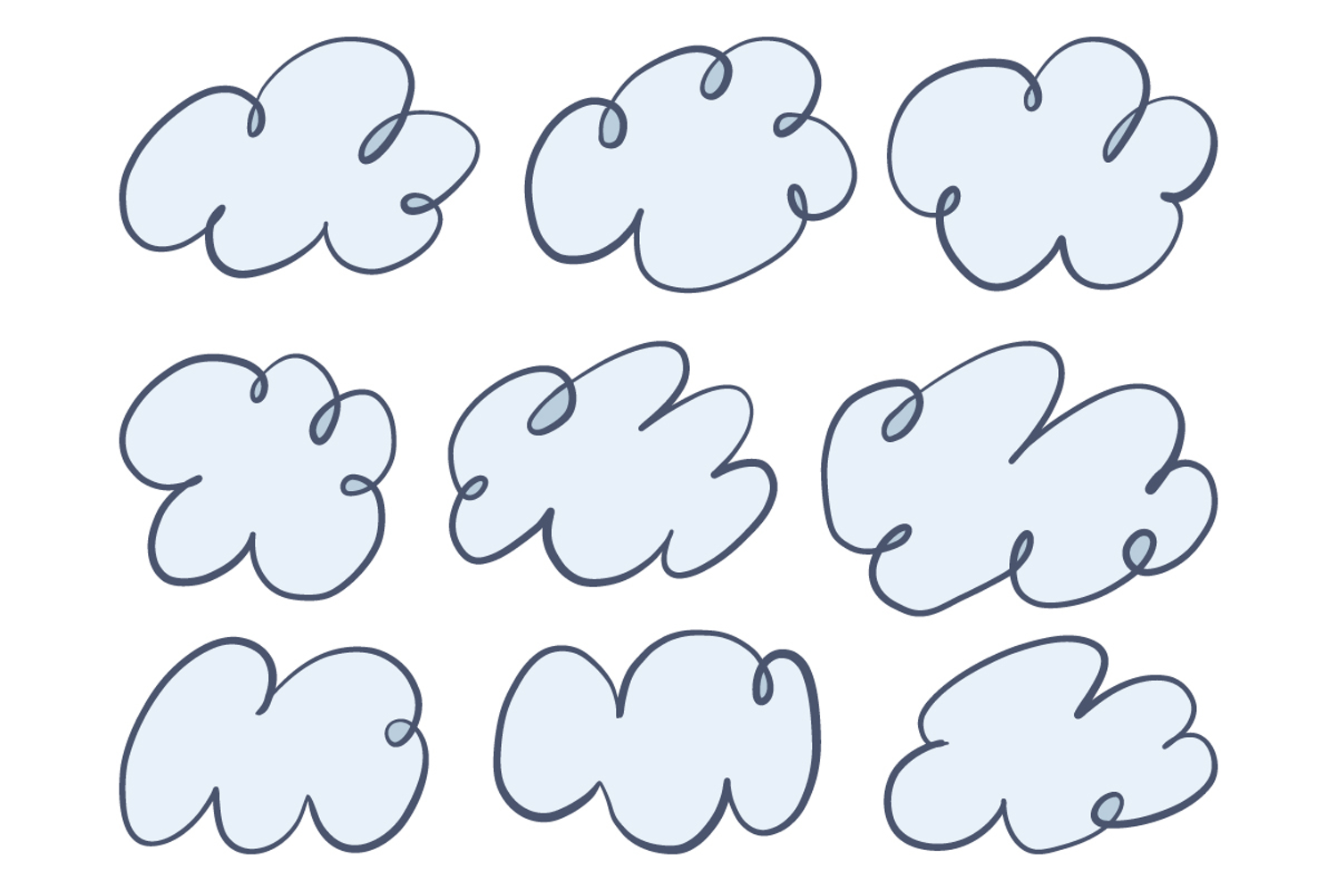This bundle features a collection of cute cloud doodle designs with soft and rounded shapes. The elements are created in a simple and playful outline style, giving a light and friendly visual appearance.